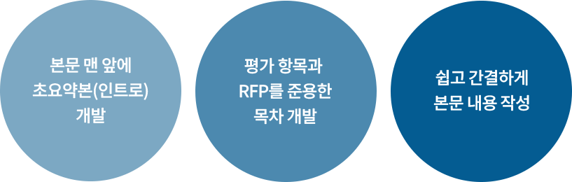 제안사가 경쟁사보다 더 해당 사업에 적합하다는 것을 보여주기 위해서는 제안서를 시작할 때, 본문의 10%이내의 초요약본(인트로)에 왜 우리가 경쟁사보다 나은지를 평가자에게 각인시켜야 한다.