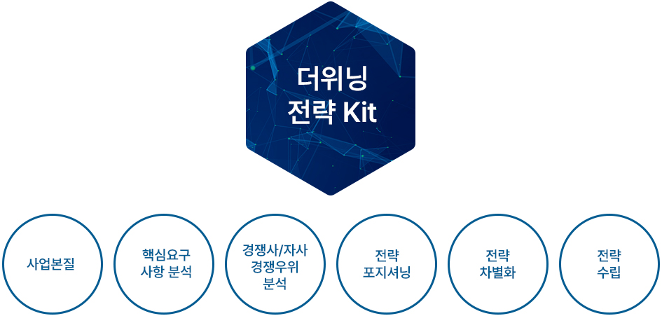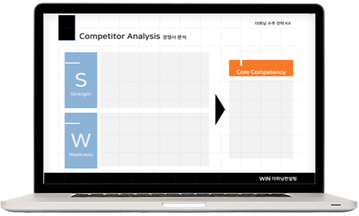 더위닝 전략 Kit을 통하여 사업본질에 대한 분석부터 전략수립까지 단계별로 진행하며, 객관적으로 경쟁사 / 제안사를 분석하여 이길 수 있는 전략을 수립합니다.